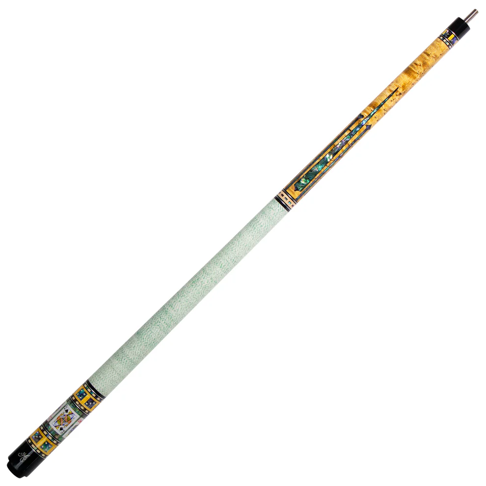 Sleeve: The butt sleeve consists of a 4 card royal flush in Spades over a 48 piece genuine Paua Shell sleeve trimmed with black on either side. Above and below this card sleeve are 6 deep inlaid Paua Shell dice with white numbering bordered on either side by 24 1/32 x1/16 rectangles. All is set in a antique stained background. The 5 inch lines on the forearm butt up against 24 brass 1/16x1/32 rectangles just above the wrap surrounded in white. The joint consists of 6 Paua Shell casino type dice with white numbers bordered on either side by stained rectangles. This design is repeated again in the shaft collar.